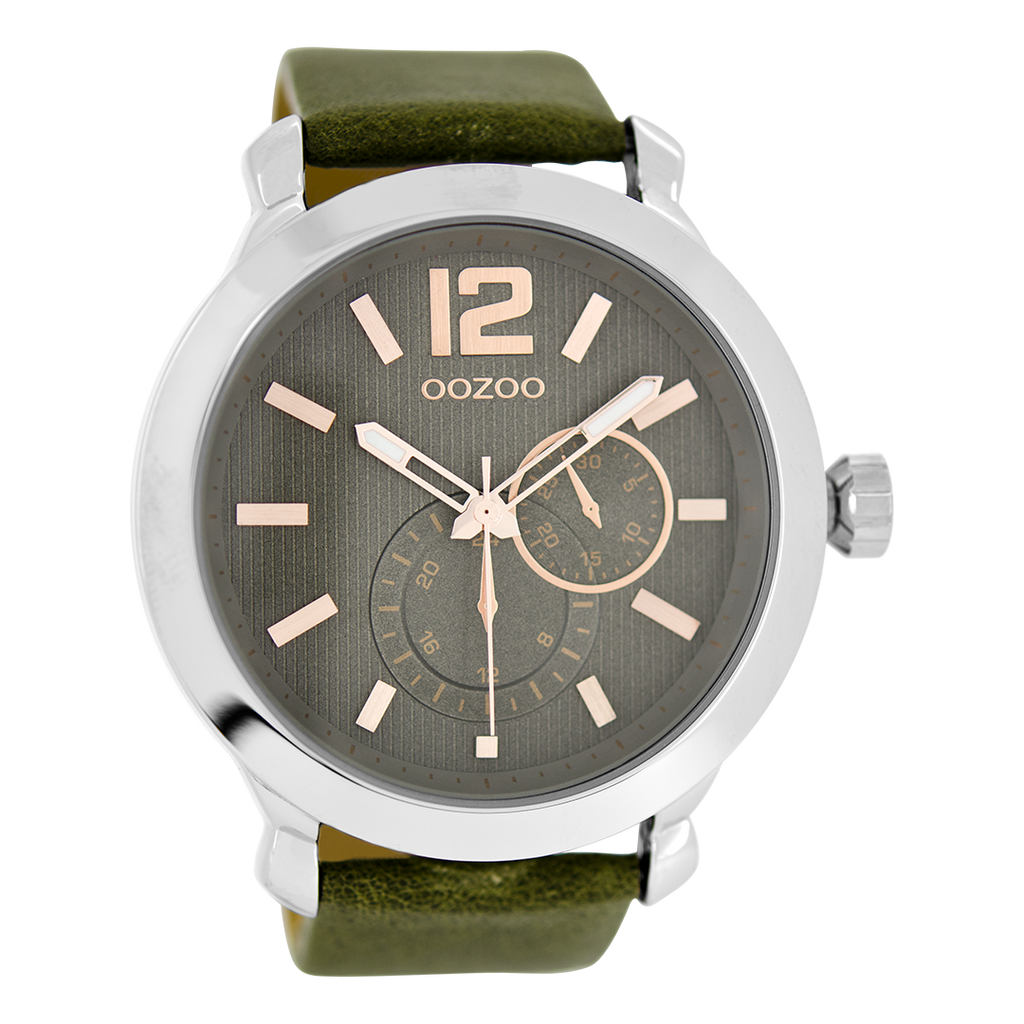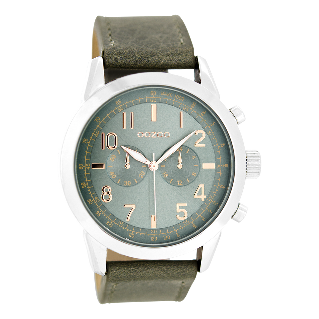 Silver coloured OOZOO watch with green grey leather strap - C6077