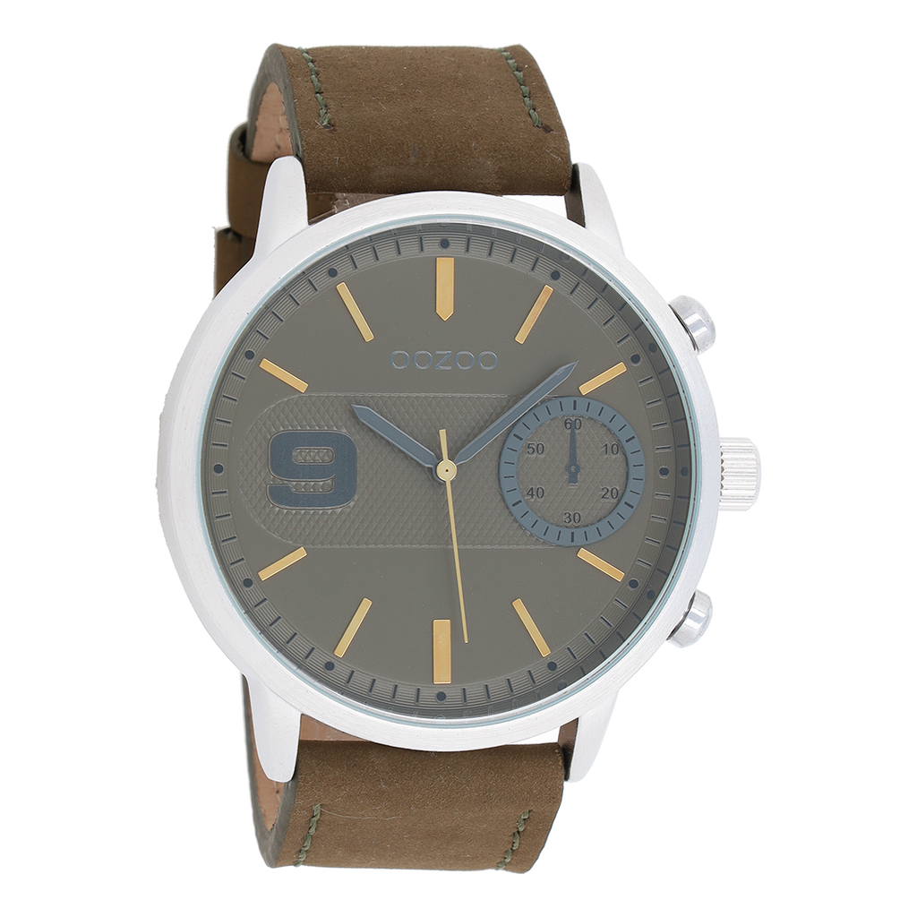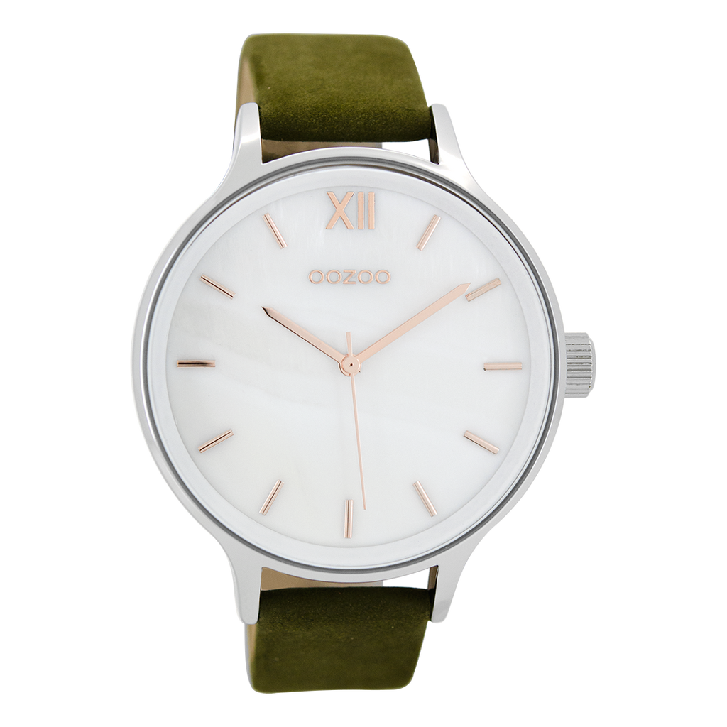Silver coloured OOZOO watch with green grey leather strap - C6066