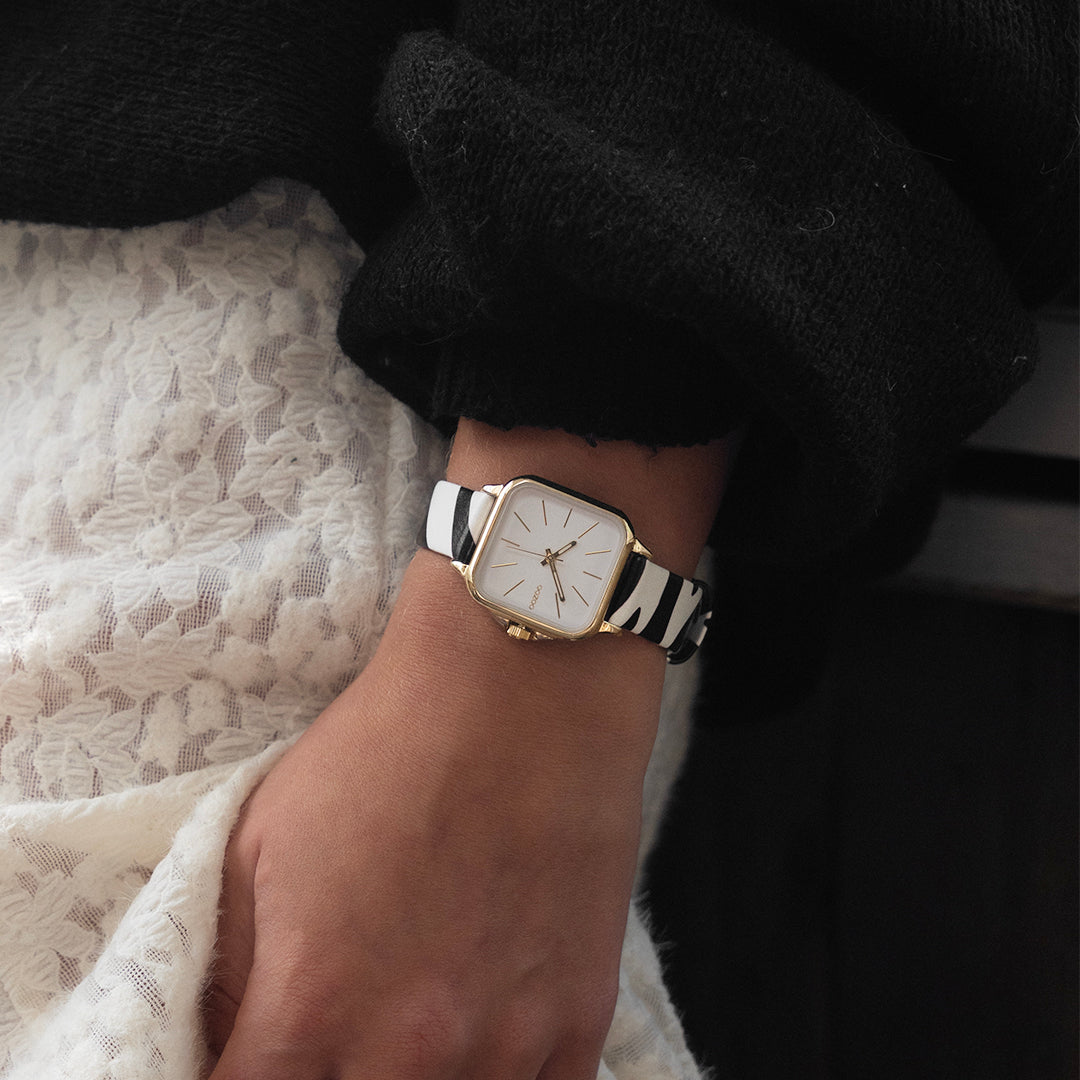 Stand out with this beautiful square ladies design from the trendy OOZOO Timepieces collection. The C11610 has a zebra print black/white leather strap and 34 mm gold coloured metal watch case. You are making quite the fashion statement with this white dial, gold coloured stripes digits and matching hands. This essential watch for your wardrobe has a mineral glass, stainless steel backplate and is nickel safe. This watch has a 2ATM Japanese movement and is covered by a 2 year warranty (see section 3 of our Refund, shipping & warranty policy).