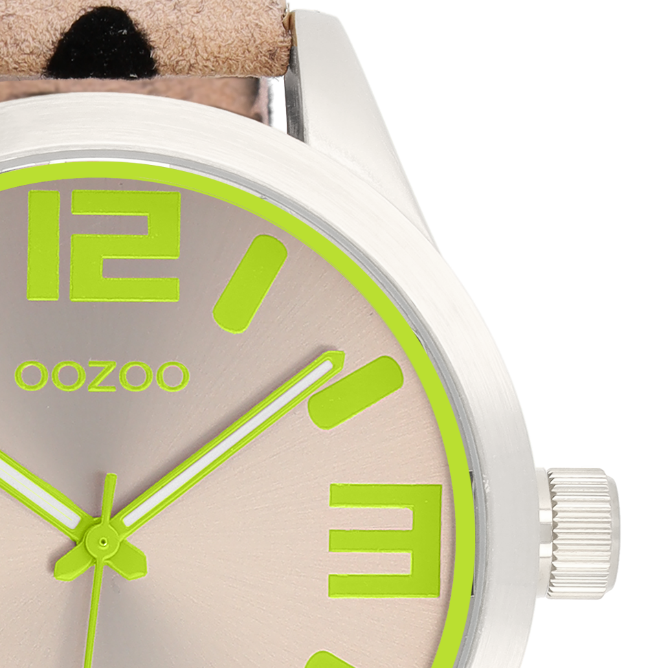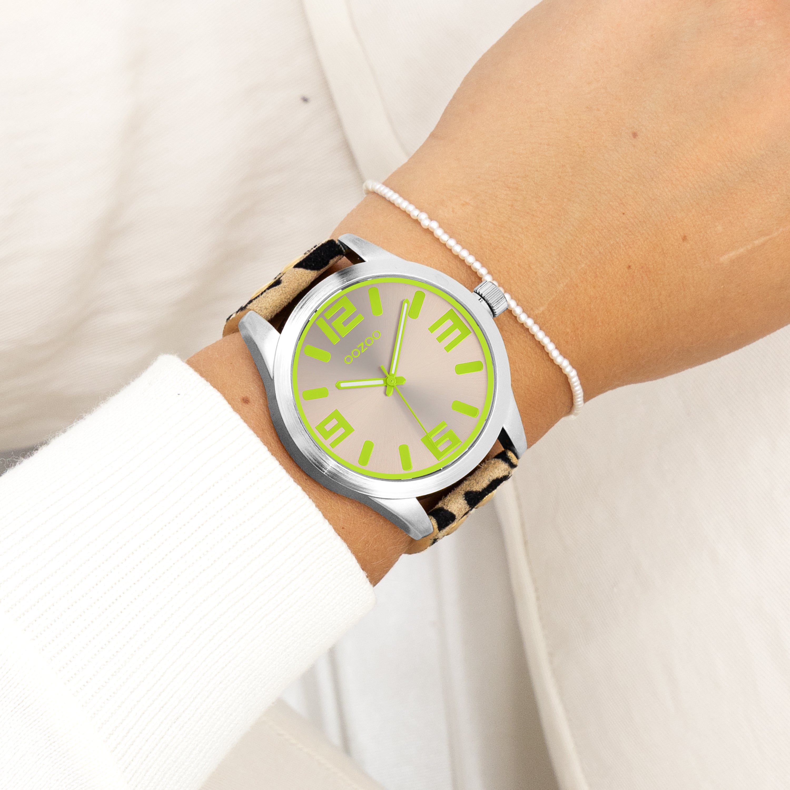 Stand out with this beautiful round ladies design from the trendy OOZOO Timepieces collection. The C0902 has a leopard print brown leather strap and 46 mm silver coloured metal watch case. You are making quite the fashion statement with this taupe sunray dial, fluo green stripes and numbers digits and matching hands. This essential watch for your wardrobe has a mineral glass, stainless steel backplate and is nickel safe. This watch has a 2ATM Japanese movement and is covered by a 2 year warranty (see section 3 of our Refund, shipping & warranty policy).