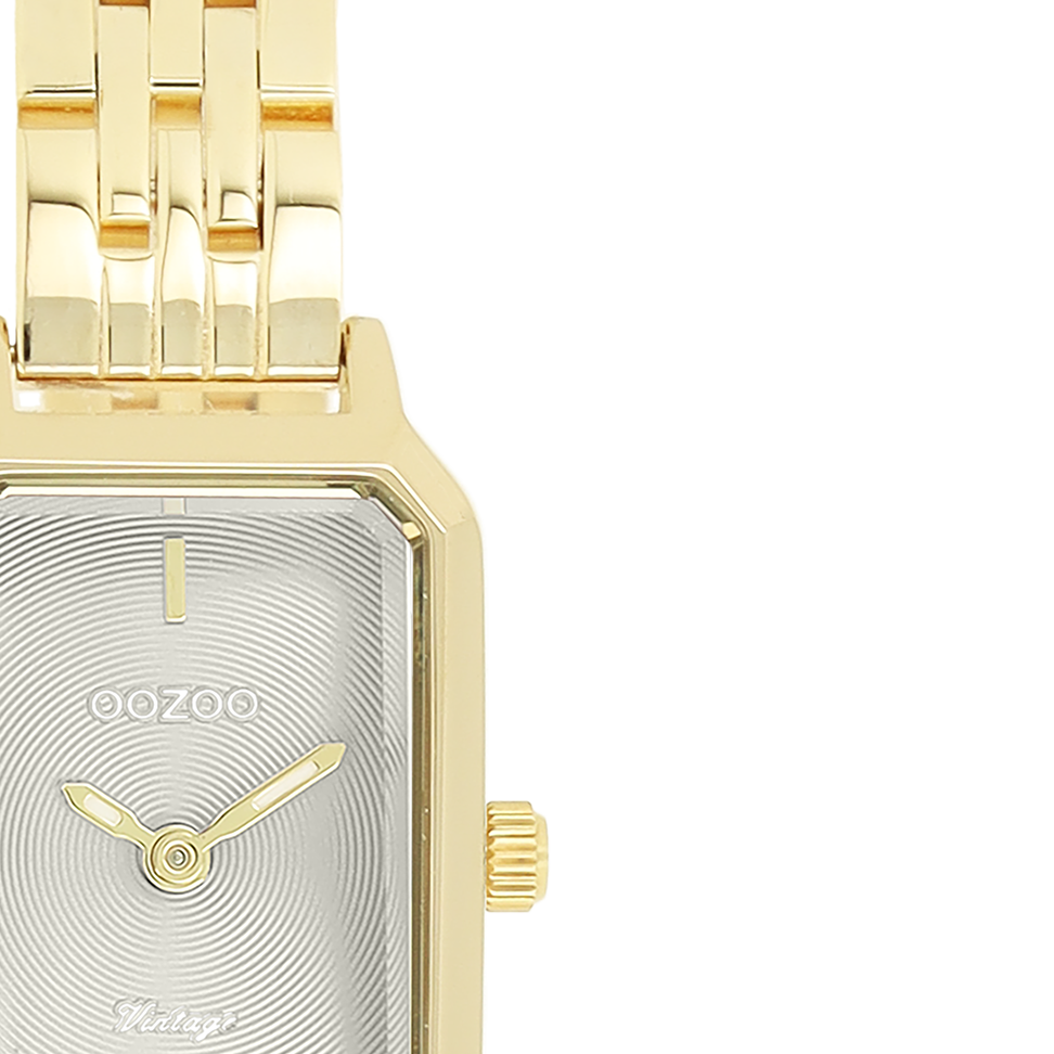 The classic look stays key in this trendy series and therefore, this rectangular OOZOO vintage design with a playful wink is the season must-have! This ladies watch is the perfect combination of fashion and comfort with its 22x19 mm gold coloured metal watch case and light grey circle pattern dial. The gold coloured stainless steel bracelet makes this watch a trendy accessory, which you can wear every day. The dial has gold coloured stripes digits and matching hands. The C20457 adds the sparkle to your outfit. The mineral glass lays in a 9,5 mm slim metal watch case with IP-plating. This design has a stainless steel backplate and is nickel safe. This watch has a 2ATM Japanese movement and is covered by a 2 year warranty (see section 3 of our Refund, shipping & warranty policy).