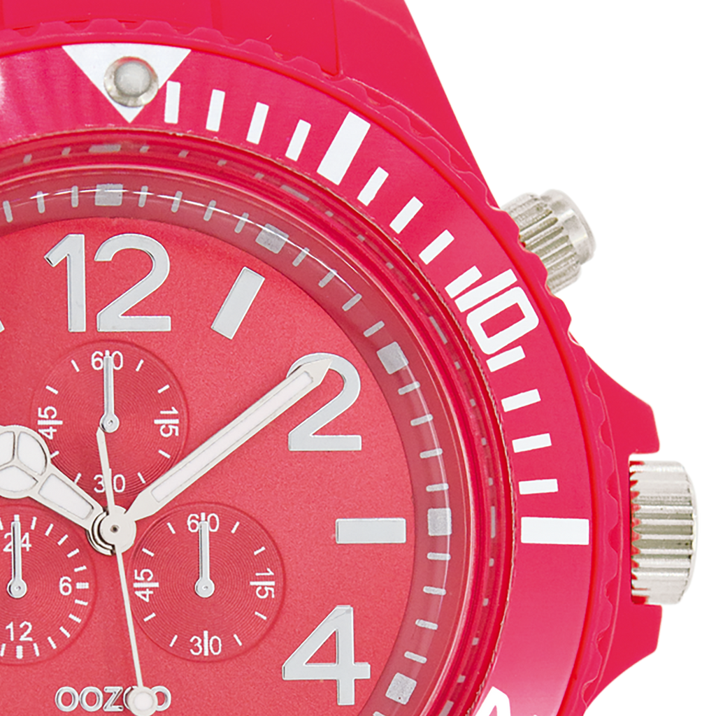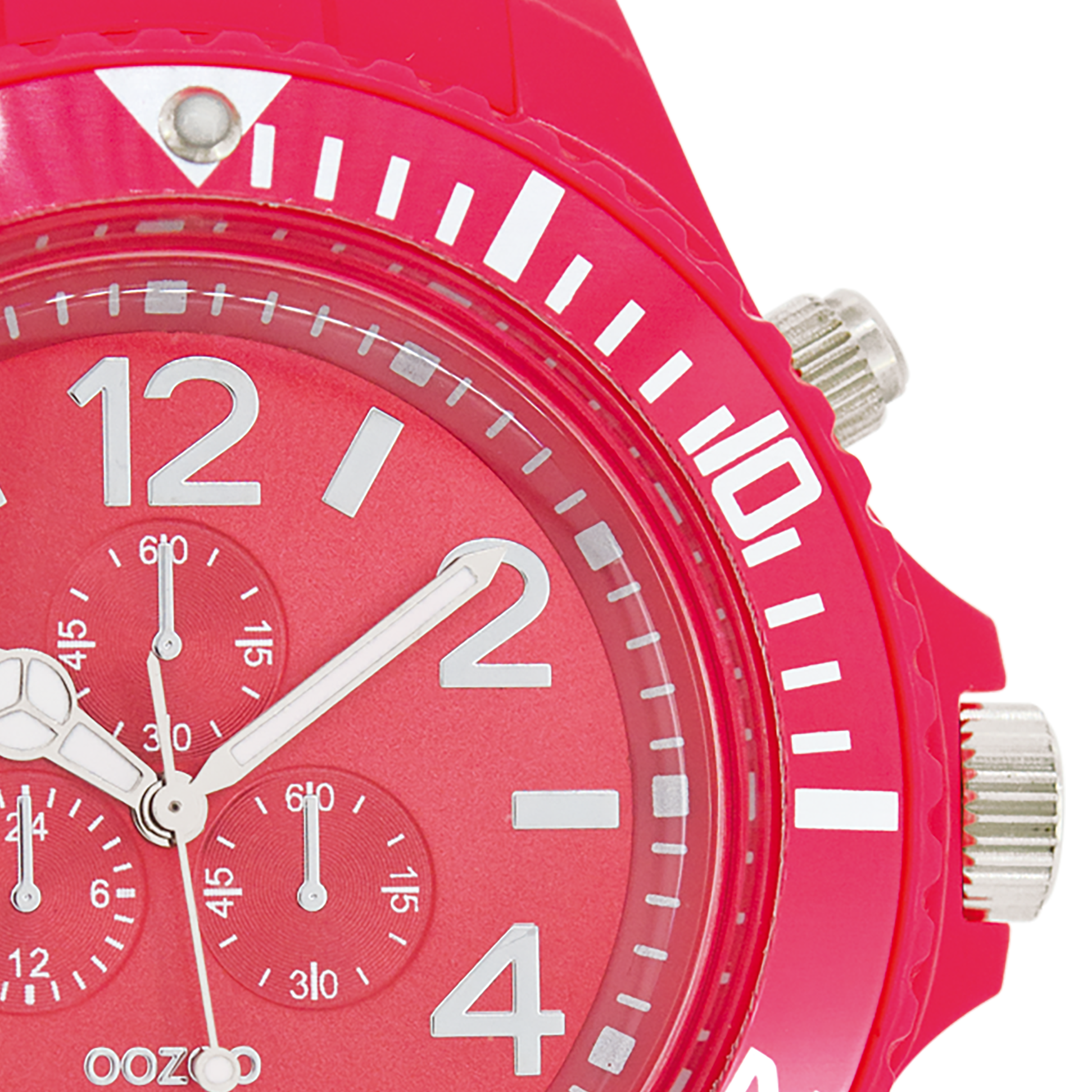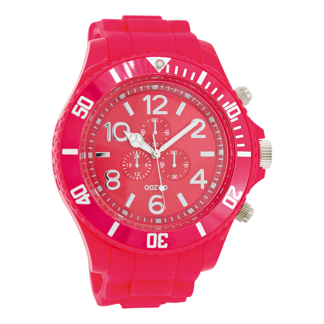 Stand out with this beautiful round unisex design from the trendy OOZOO Timepieces collection. The C4827 has a fluo pink rubber strap and 48 mm fluo pink plastic watch case. You are making quite the fashion statement with this fluo pink sunray dial, silver coloured stripes and numbers digits and silver coloured/white hands. This essential watch for your wardrobe has a mineral glass, stainless steel backplate and is nickel safe. This watch has a 2 Japanese movement and is covered by a 2 year warranty (see section 3 of our Refund, shipping & warranty policy).