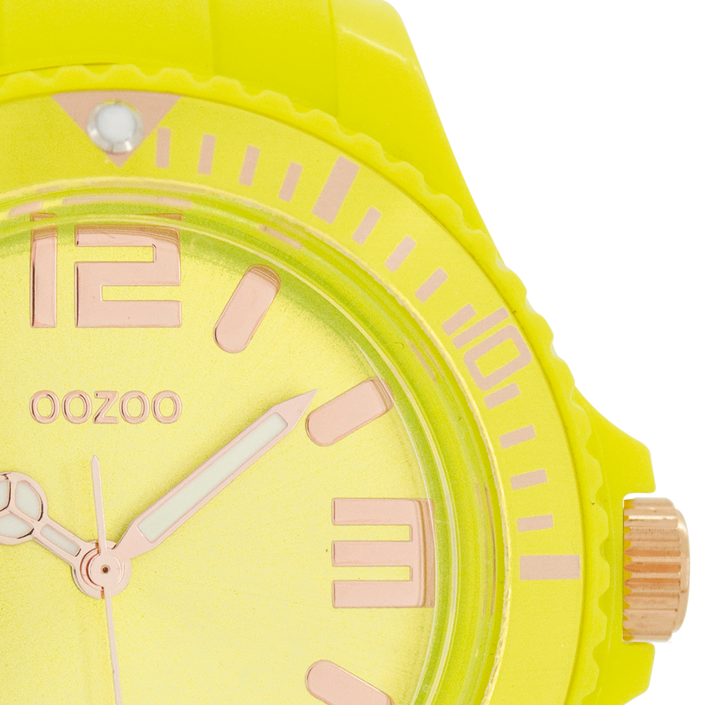 Stand out with this beautiful round unisex design from the trendy OOZOO Timepieces collection. The C5033 has a yellow rubber strap and 48 mm yellow plastic watch case. You are making quite the fashion statement with this yellow sunray dial, rose gold coloured stripes and numbers digits and rose gold coloured/white hands. This essential watch for your wardrobe has a mineral glass, stainless steel backplate and is nickel safe. This watch has a 2 Japanese movement and is covered by a 2 year warranty (see section 3 of our Refund, shipping & warranty policy).