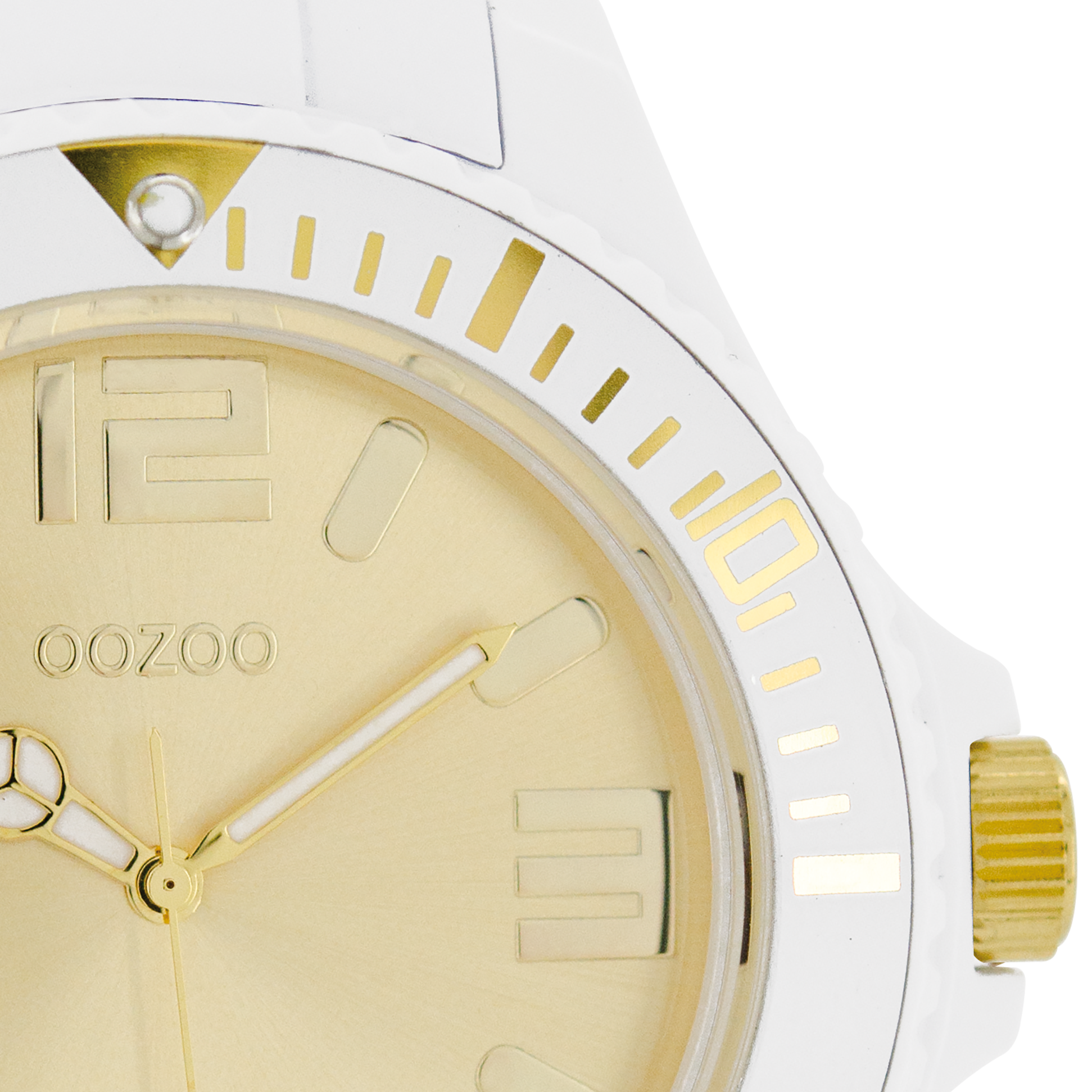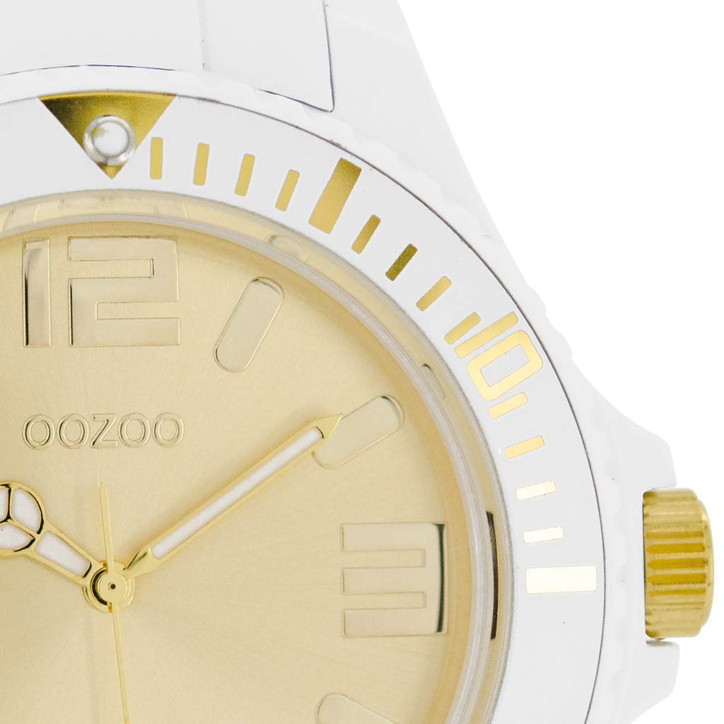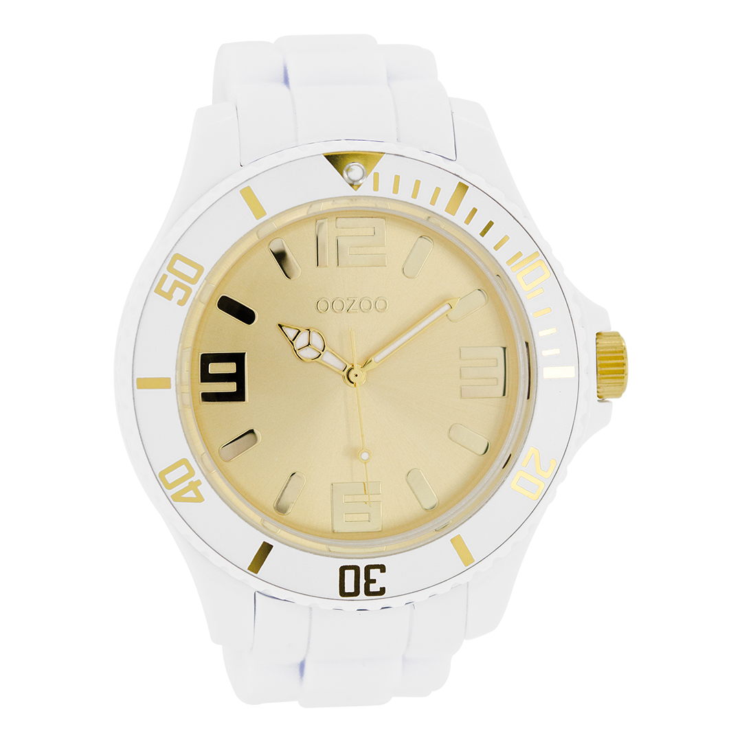 Stand out with this beautiful round unisex design from the trendy OOZOO Timepieces collection. The C5043 has a white rubber strap and 48 mm white plastic watch case. You are making quite the fashion statement with this gold coloured sunray dial, gold coloured stripes and numbers digits and gold coloured/white hands. This essential watch for your wardrobe has a mineral glass, stainless steel backplate and is nickel safe. This watch has a 2 Japanese movement and is covered by a 2 year warranty (see section 3 of our Refund, shipping & warranty policy).