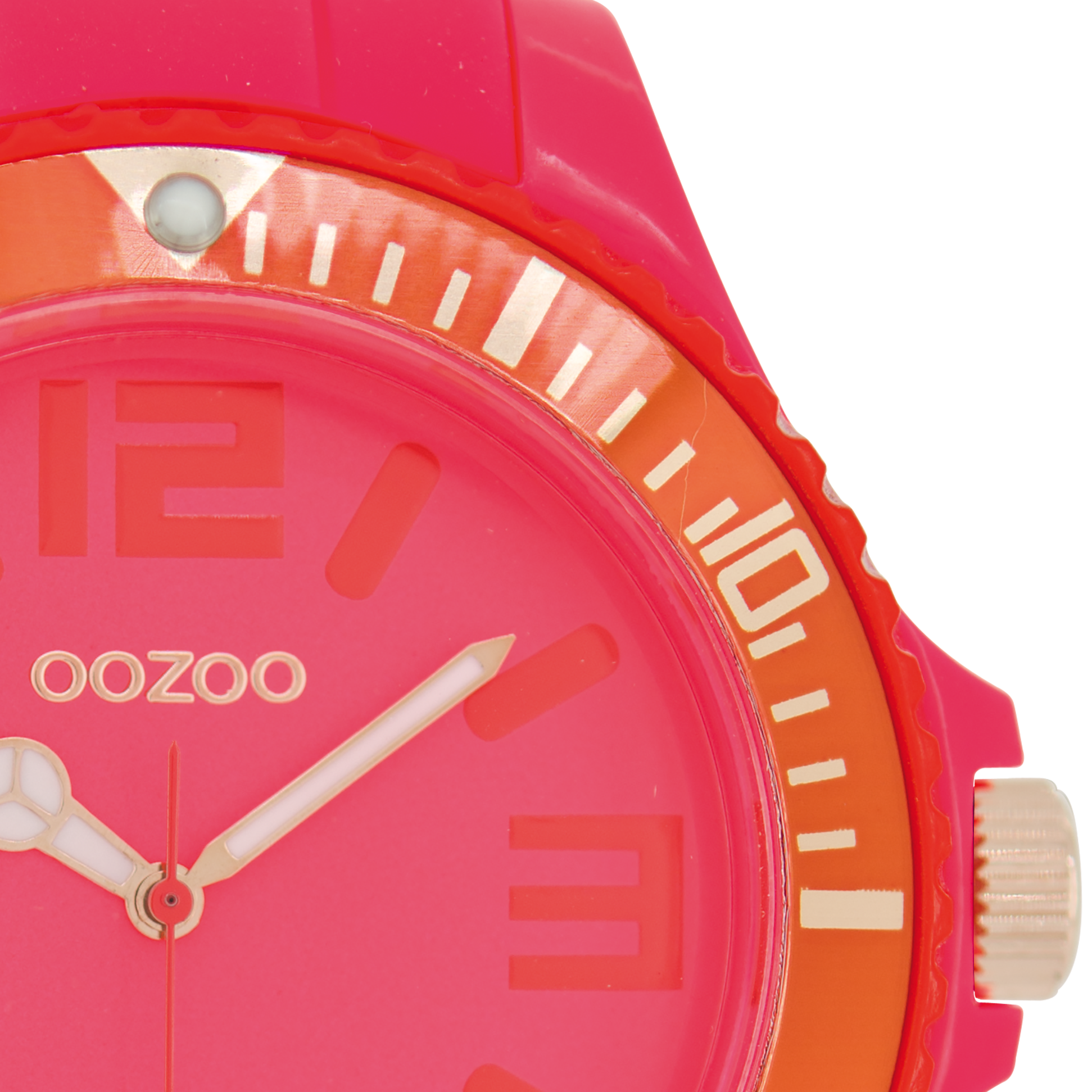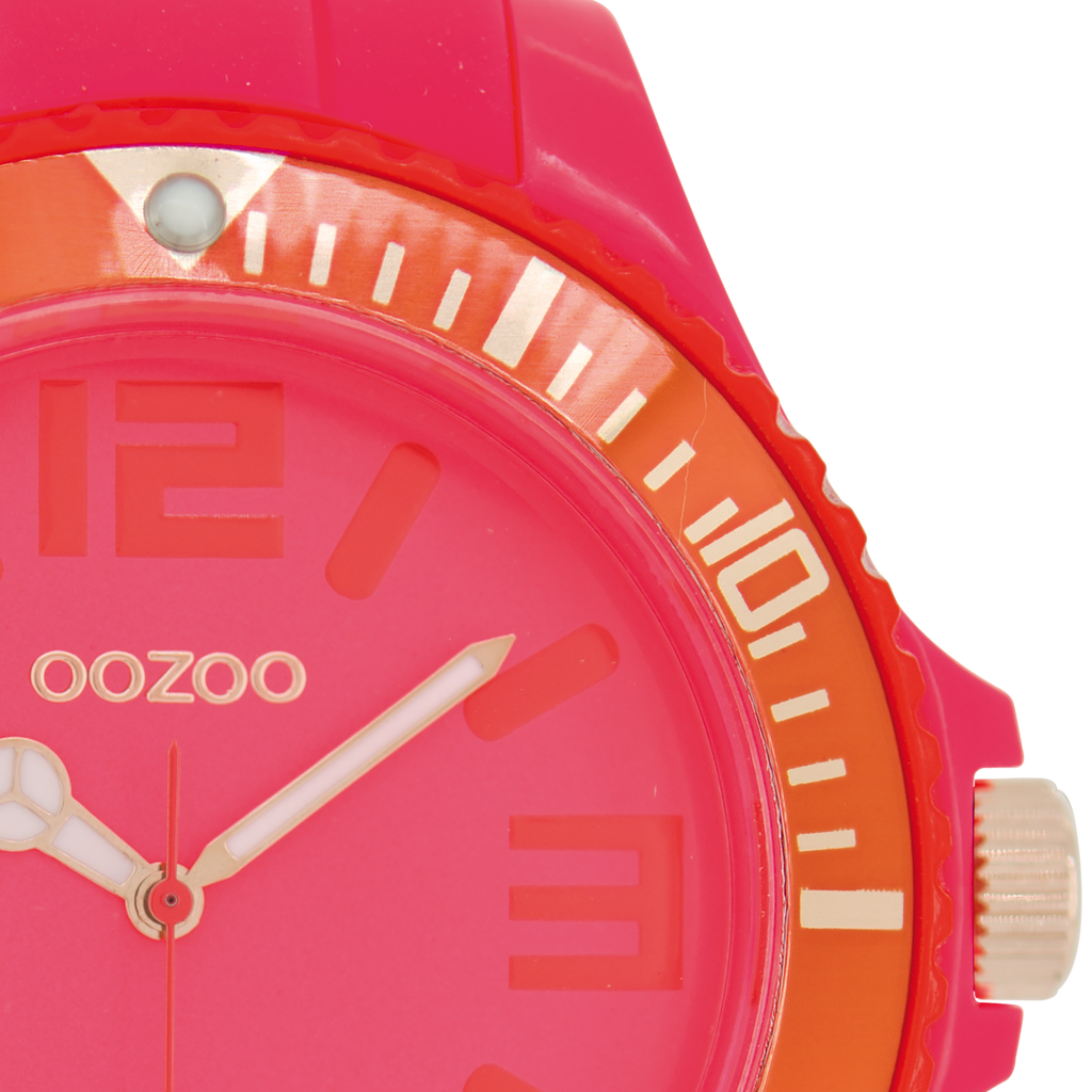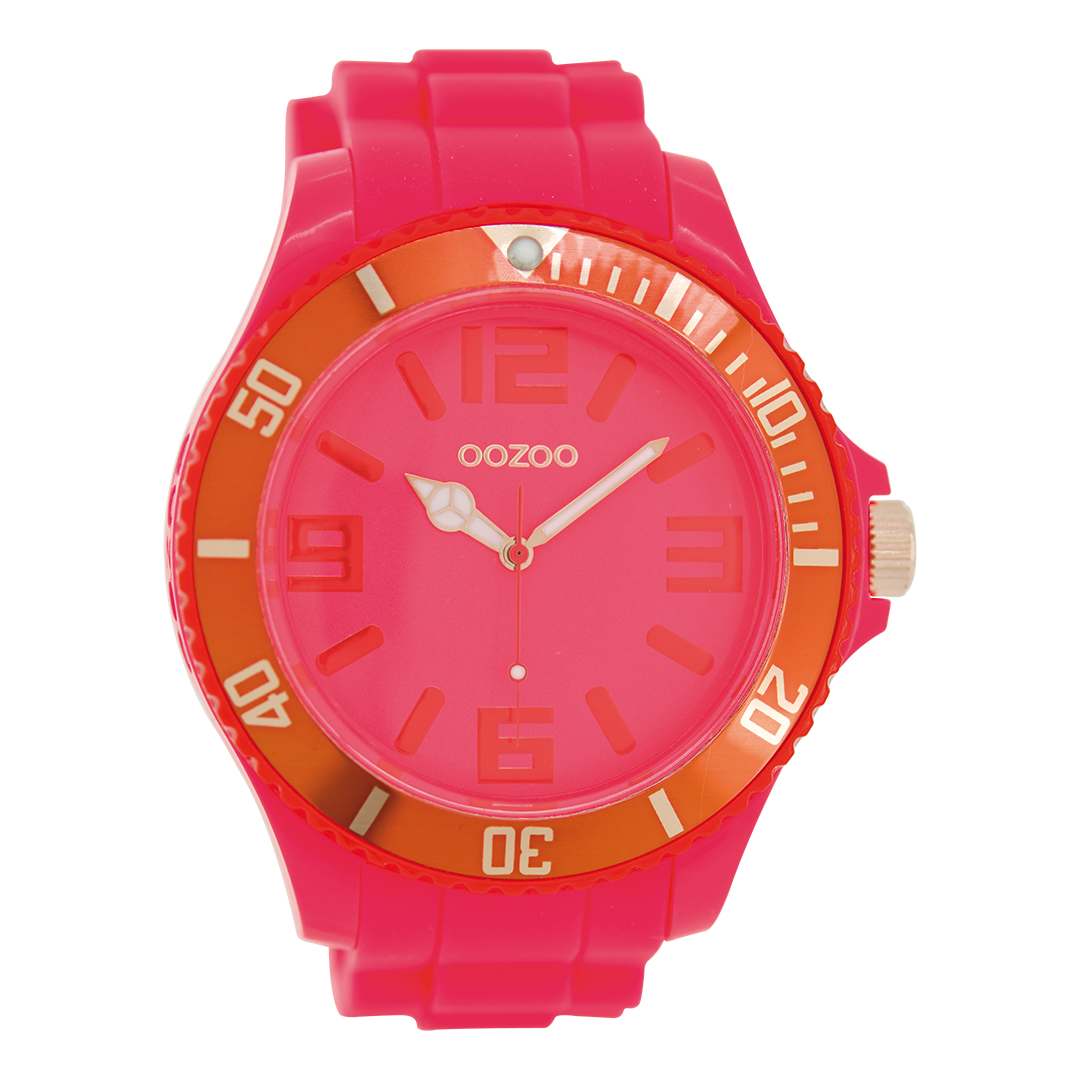 Stand out with this beautiful round unisex design from the trendy OOZOO Timepieces collection. The C5838 has a fluo pink rubber strap and 48 mm fluo pink plastic watch case. You are making quite the fashion statement with this fluo pink dial, red stripes and numbers digits and silver coloured/white hands. This essential watch for your wardrobe has a mineral glass, stainless steel backplate and is nickel safe. This watch has a 2 Japanese movement and is covered by a 2 year warranty (see section 3 of our Refund, shipping & warranty policy).