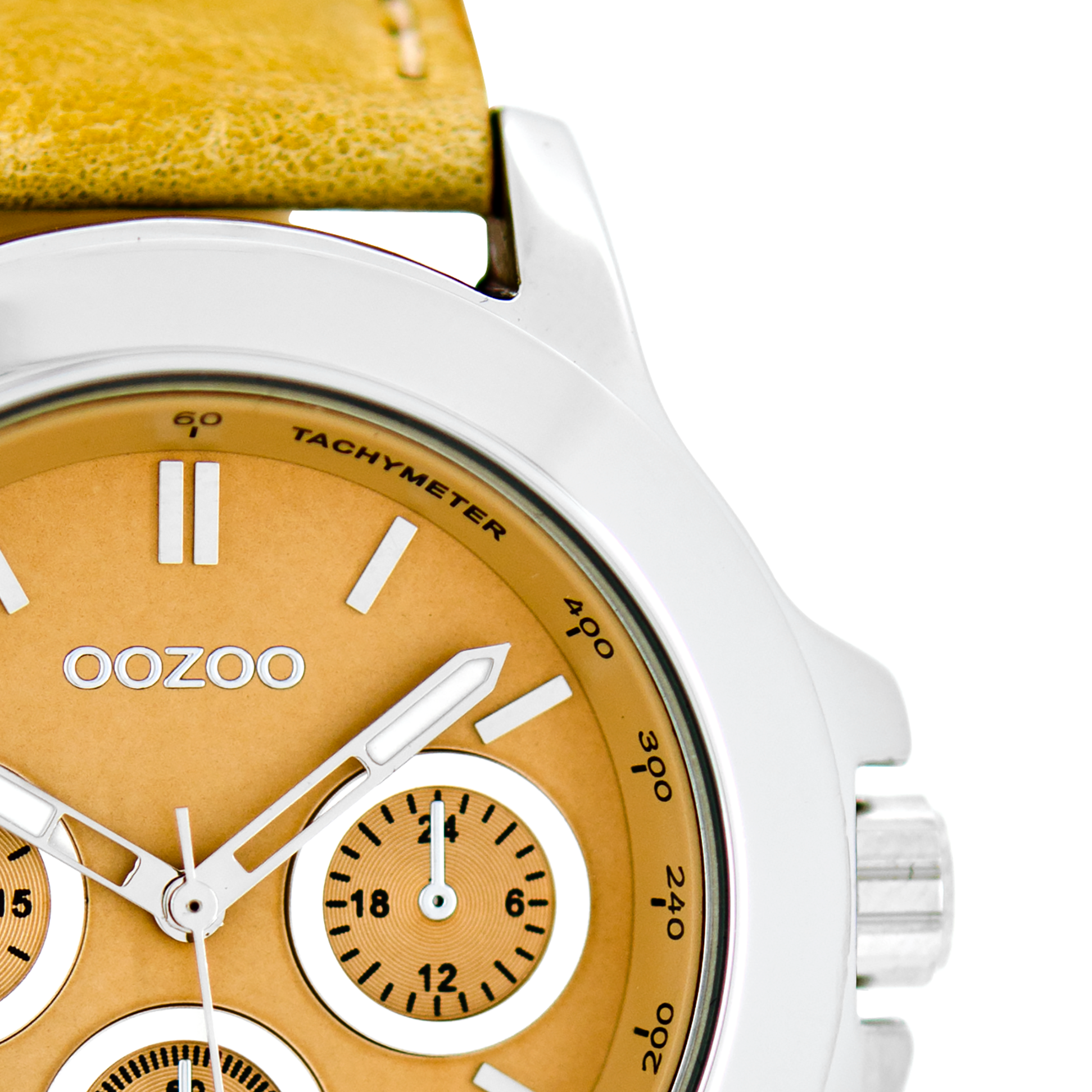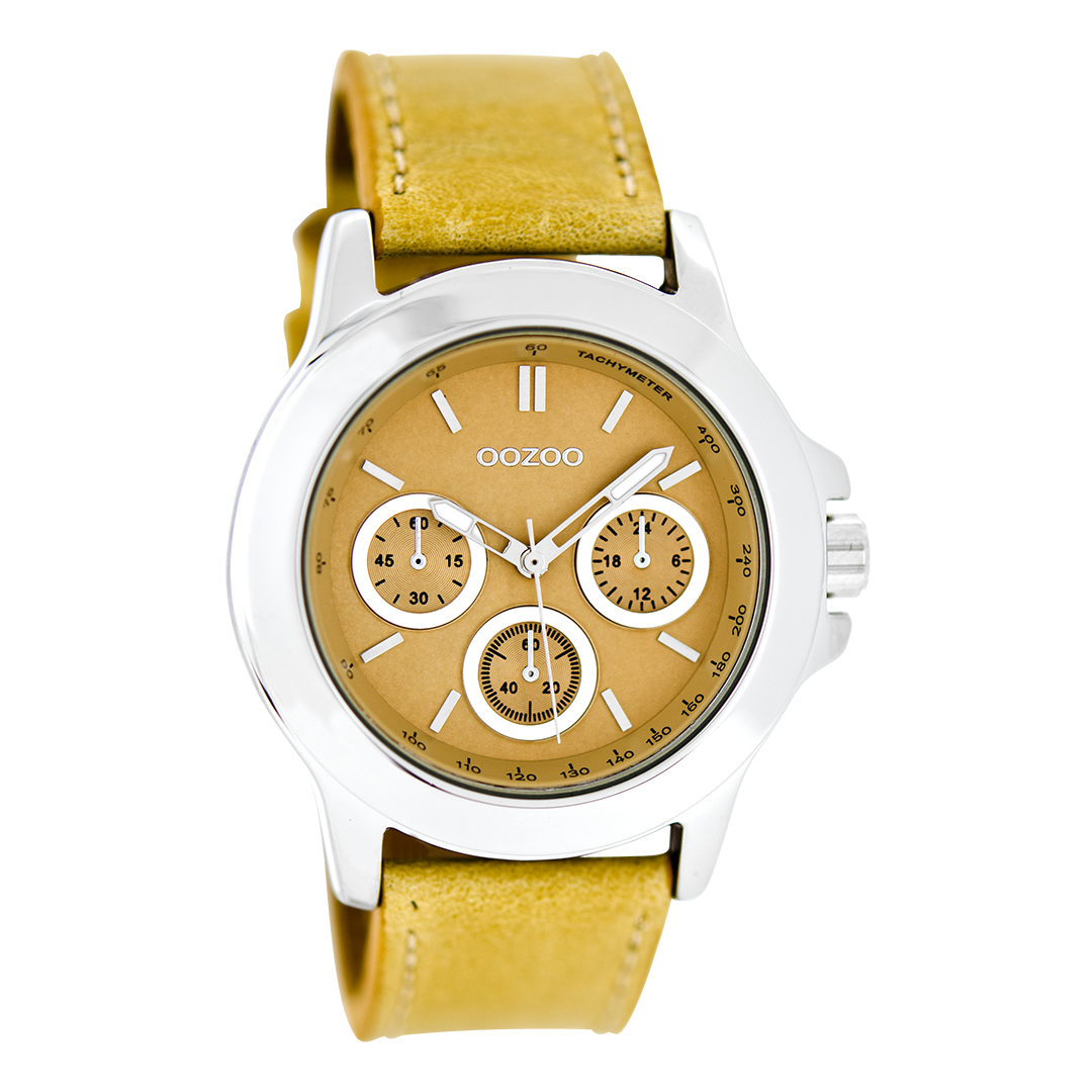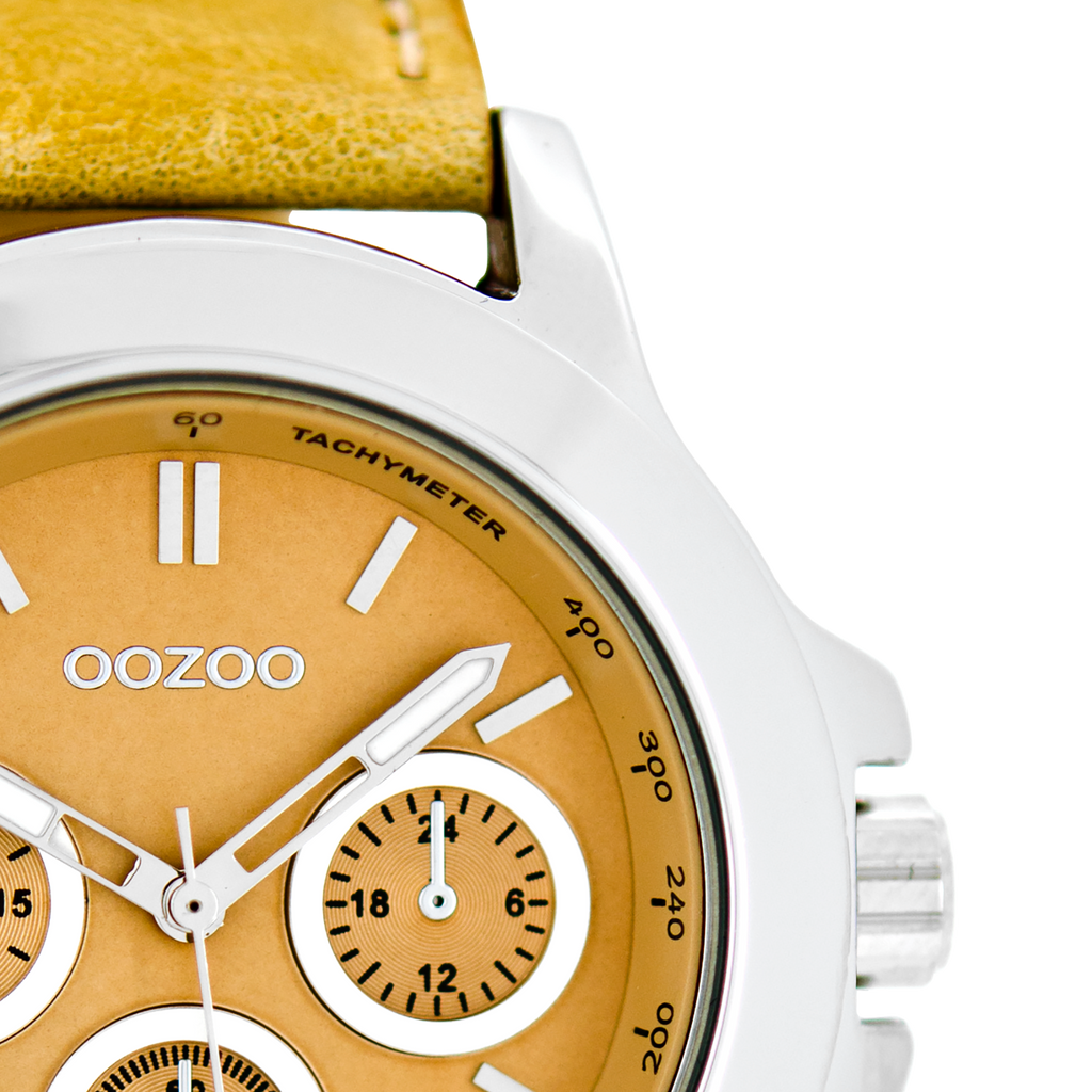 Stand out with this beautiful round ladies design from the trendy OOZOO Timepieces collection. The C6185 has a stitched beige leather strap and 40 mm silver coloured metal watch case. You are making quite the fashion statement with this beige chrono dial, silver coloured stripes digits and matching hands. This essential watch for your wardrobe has a mineral glass, stainless steel backplate and is nickel safe. This watch has a 2 Japanese movement and is covered by a 2 year warranty (see section 3 of our Refund, shipping & warranty policy).