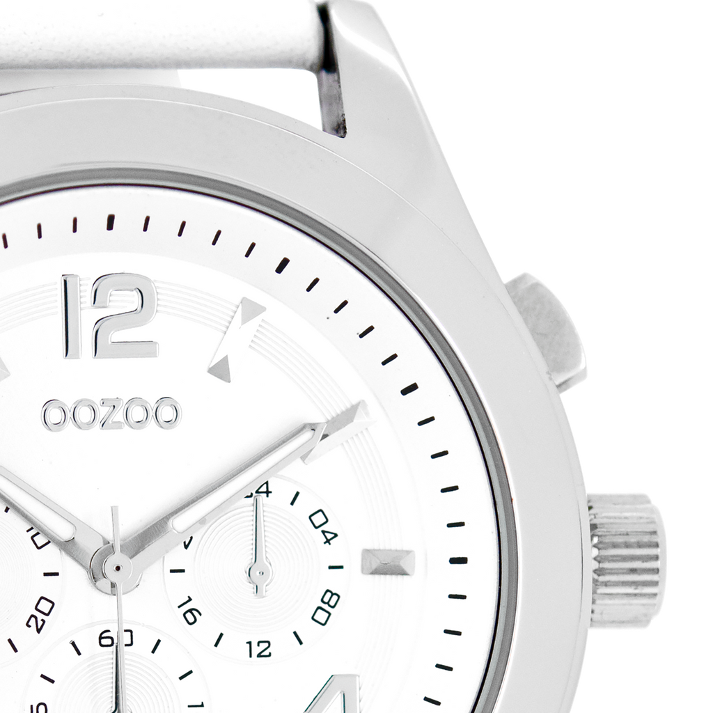 Stand out with this beautiful round ladies design from the trendy OOZOO Timepieces collection. The C6585 has a stitched white leather strap and 45 mm silver coloured metal watch case. You are making quite the fashion statement with this white chrono dial, silver coloured stripes and numbers digits and silver coloured/white hands. This essential watch for your wardrobe has a mineral glass, stainless steel backplate and is nickel safe. This watch has a 2 Japanese movement and is covered by a 2 year warranty (see section 3 of our Refund, shipping & warranty policy).