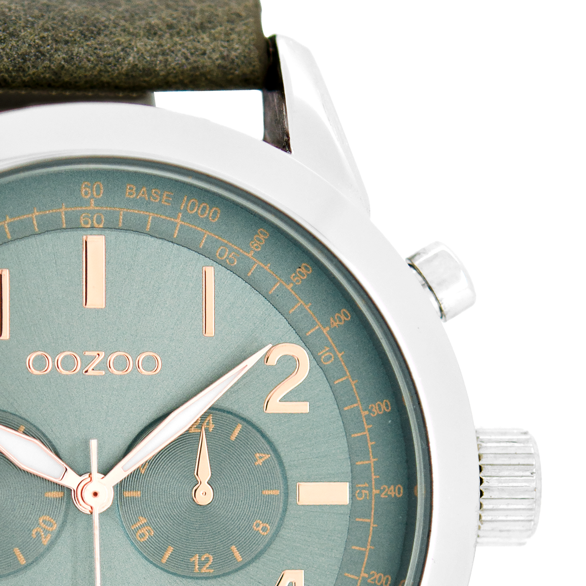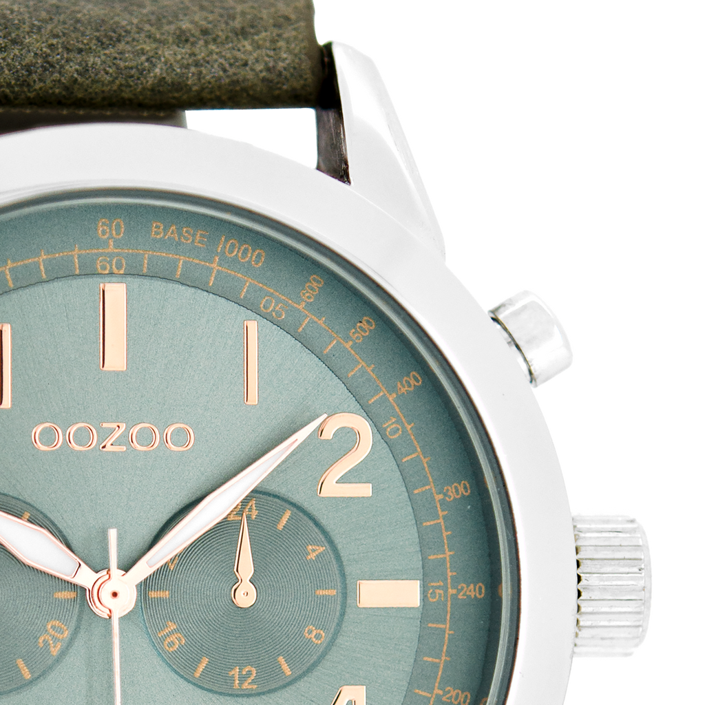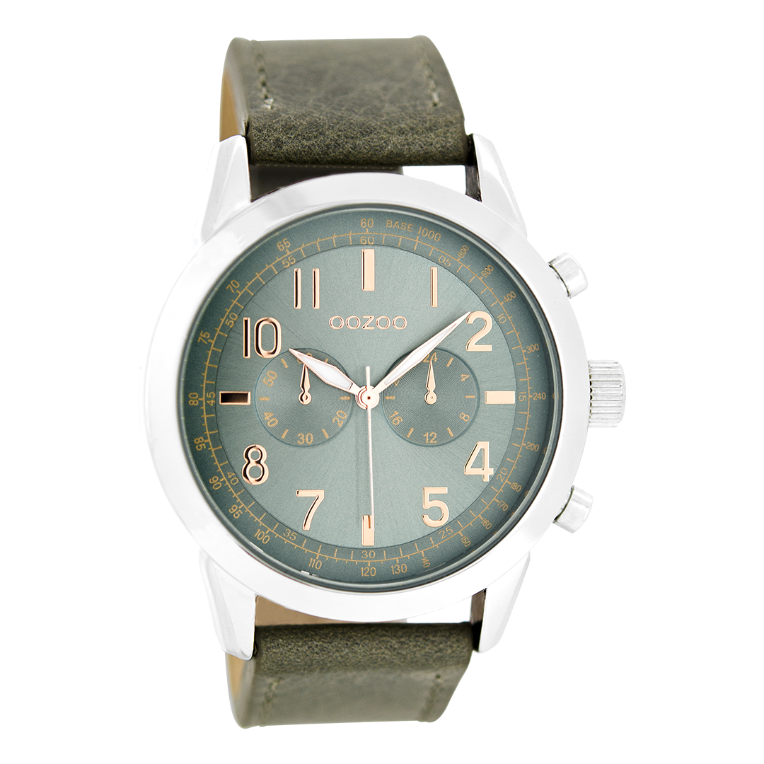 Silver coloured OOZOO watch with green grey leather strap - C6886
