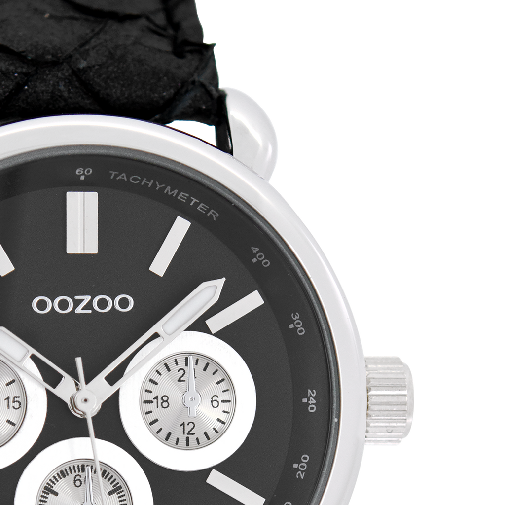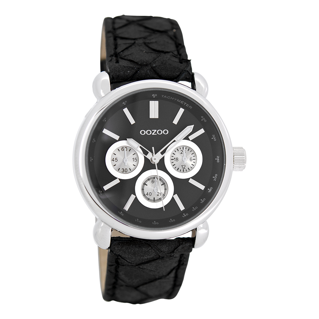 Stand out with this beautiful round ladies design from the trendy OOZOO Timepieces collection. The C7139 has a snake black leather strap and 45 mm silver coloured metal watch case. You are making quite the fashion statement with this black chrono dial, silver coloured stripes digits and matching hands. This essential watch for your wardrobe has a mineral glass, stainless steel backplate and is nickel safe. This watch has a 2 Japanese movement and is covered by a 2 year warranty (see section 3 of our Refund, shipping & warranty policy).