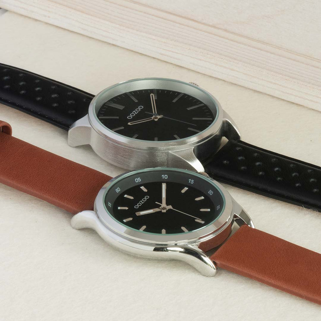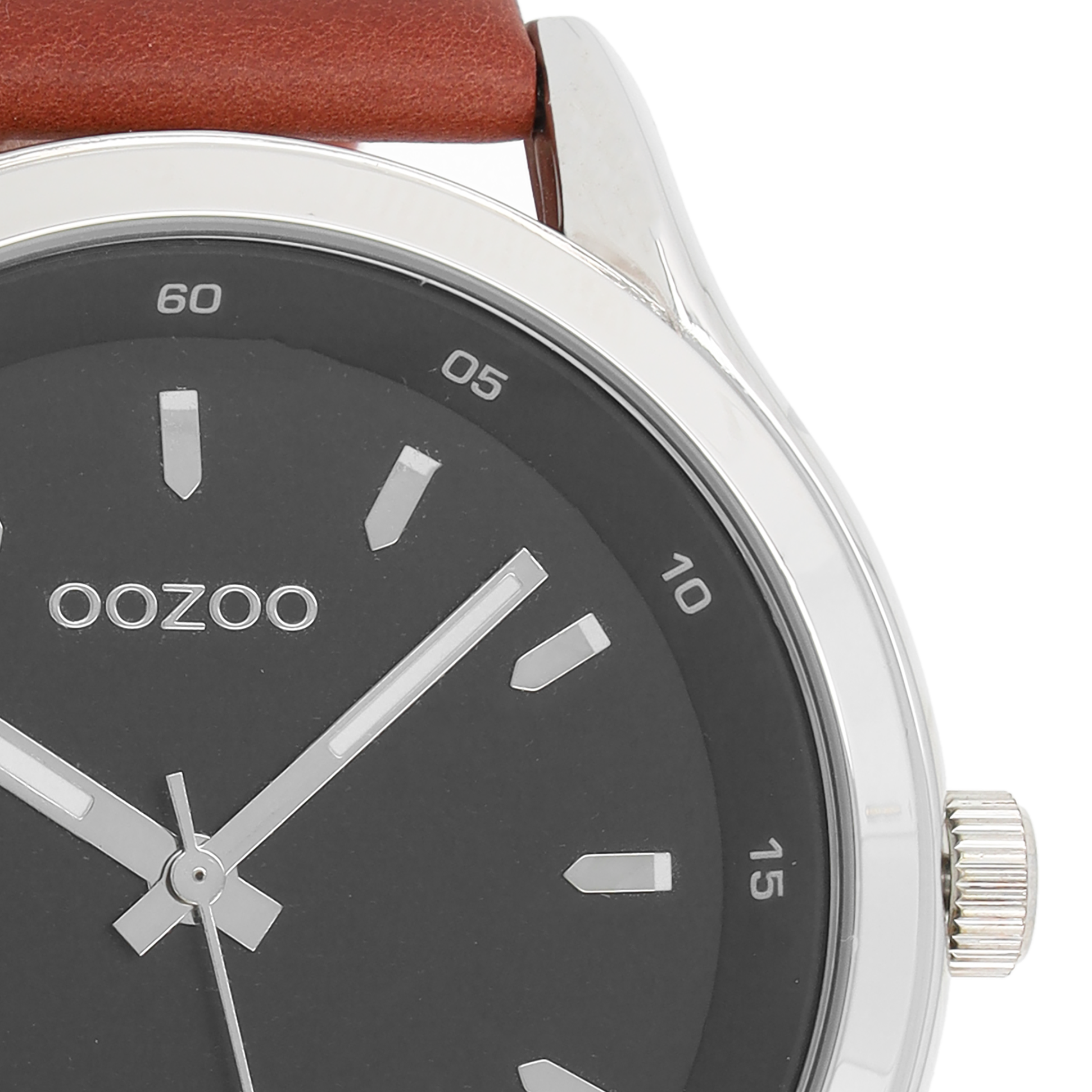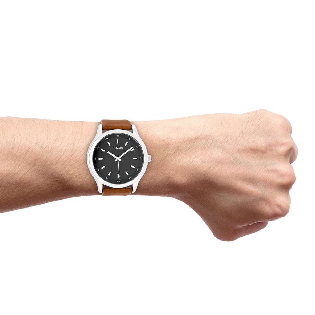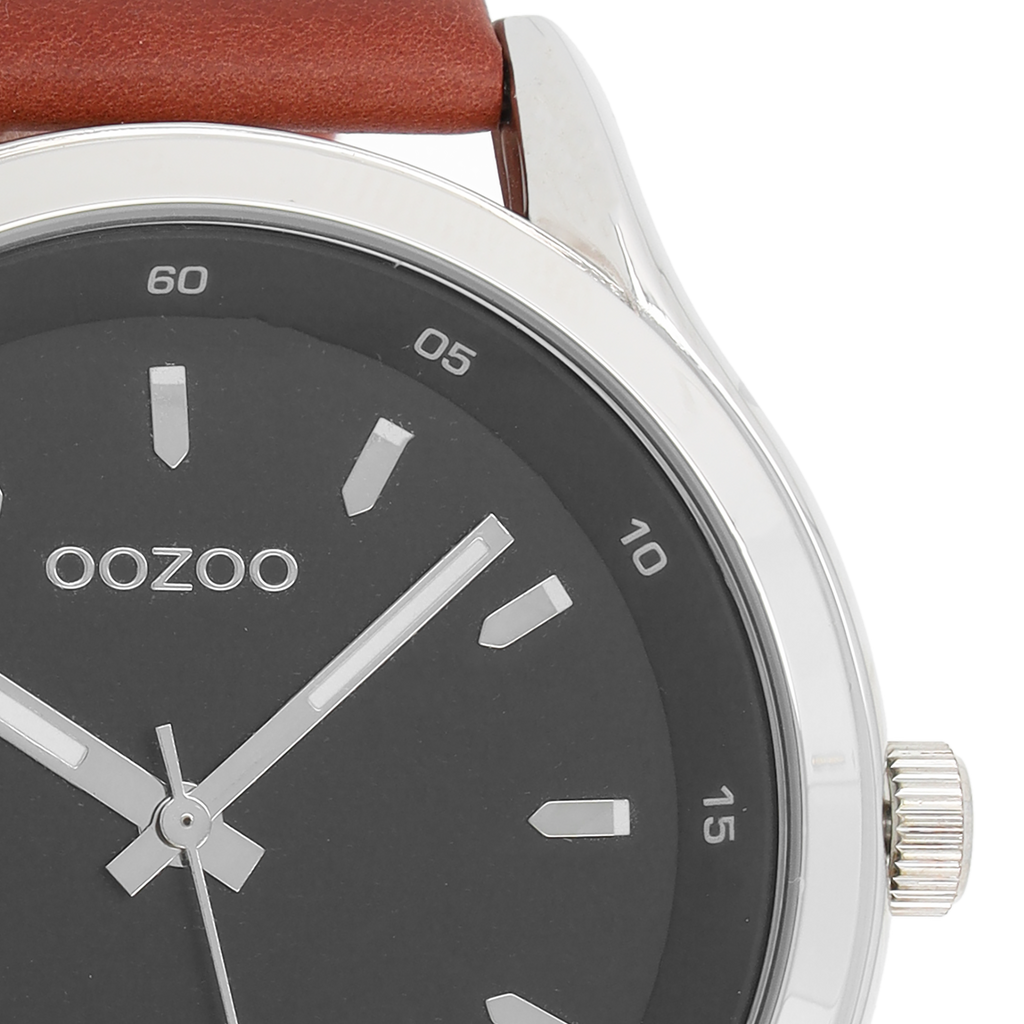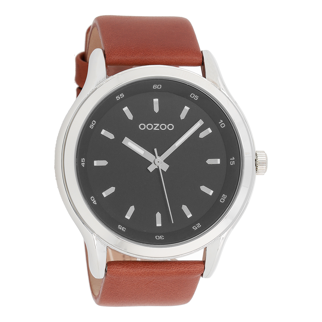 Silver coloured OOZOO watch with cognac leather strap - C7431
