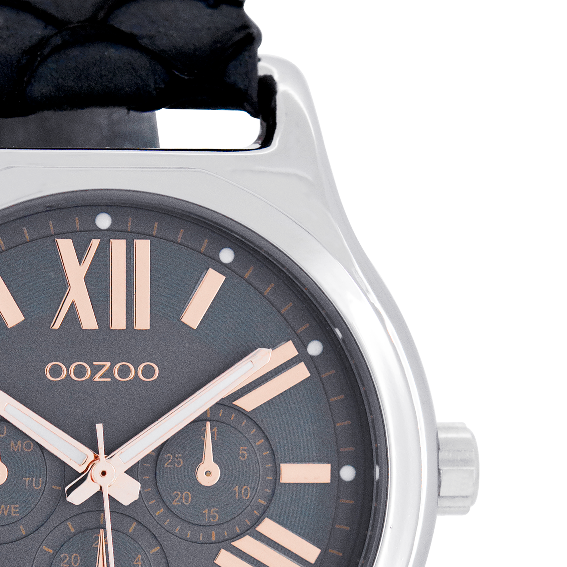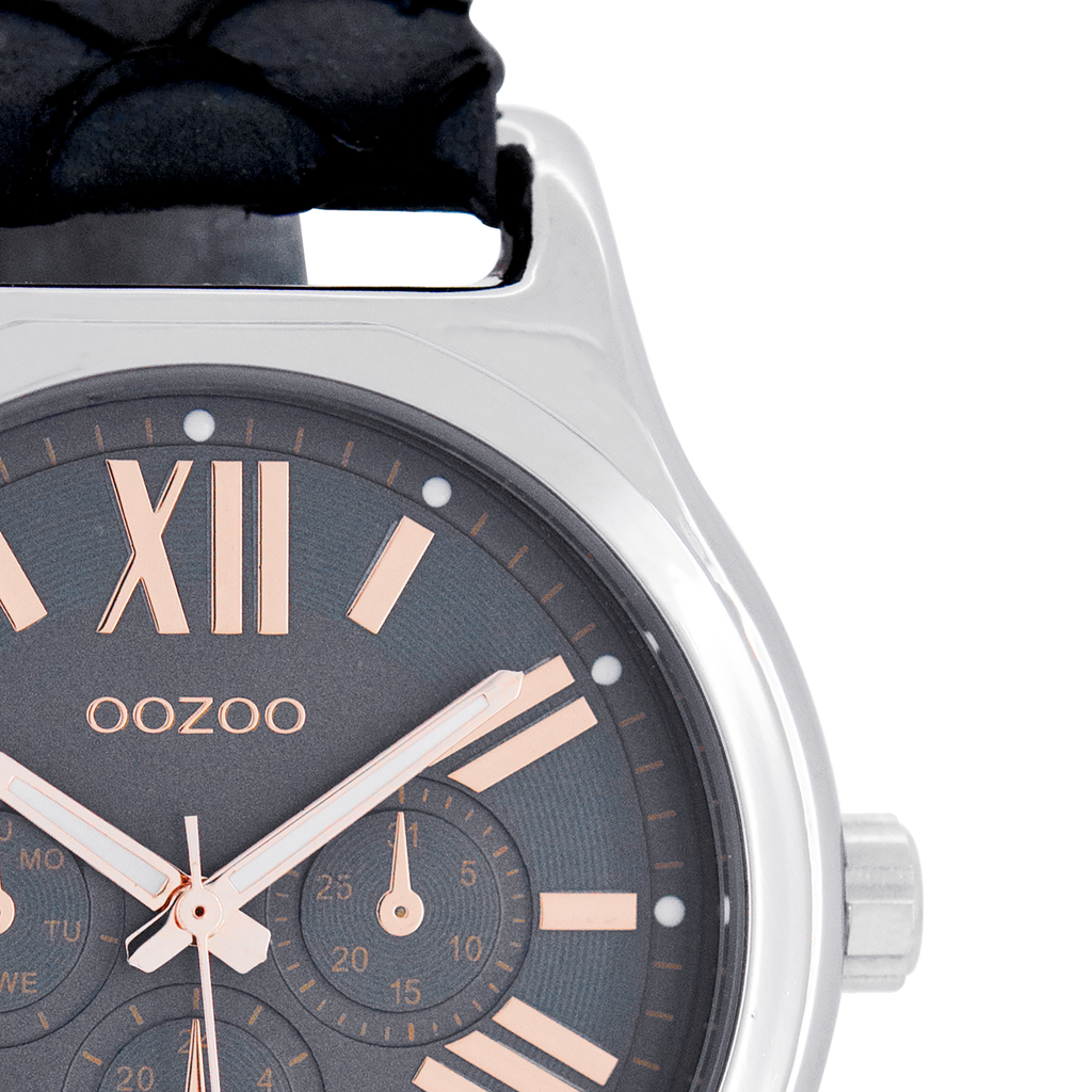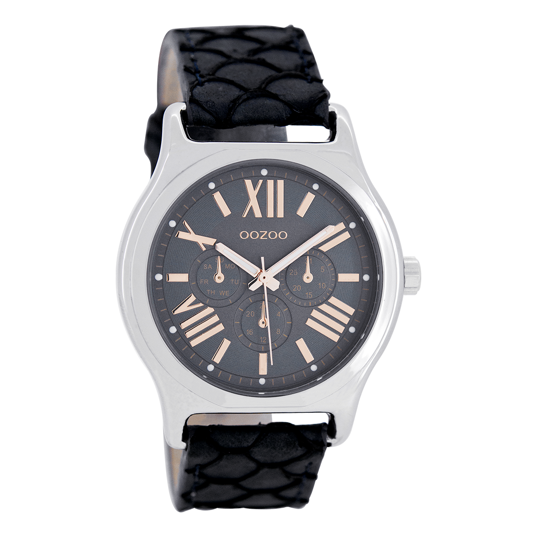 Stand out with this beautiful round ladies design from the trendy OOZOO Timepieces collection. The C7612 has a snake dark blue leather strap and 40x37 mm silver coloured metal watch case. You are making quite the fashion statement with this dark blue chrono dial, rose gold coloured Roman numerals digits and rose gold coloured/white hands. This essential watch for your wardrobe has a mineral glass, stainless steel backplate and is nickel safe. This watch has a 2 Japanese movement and is covered by a 2 year warranty (see section 3 of our Refund, shipping & warranty policy).
