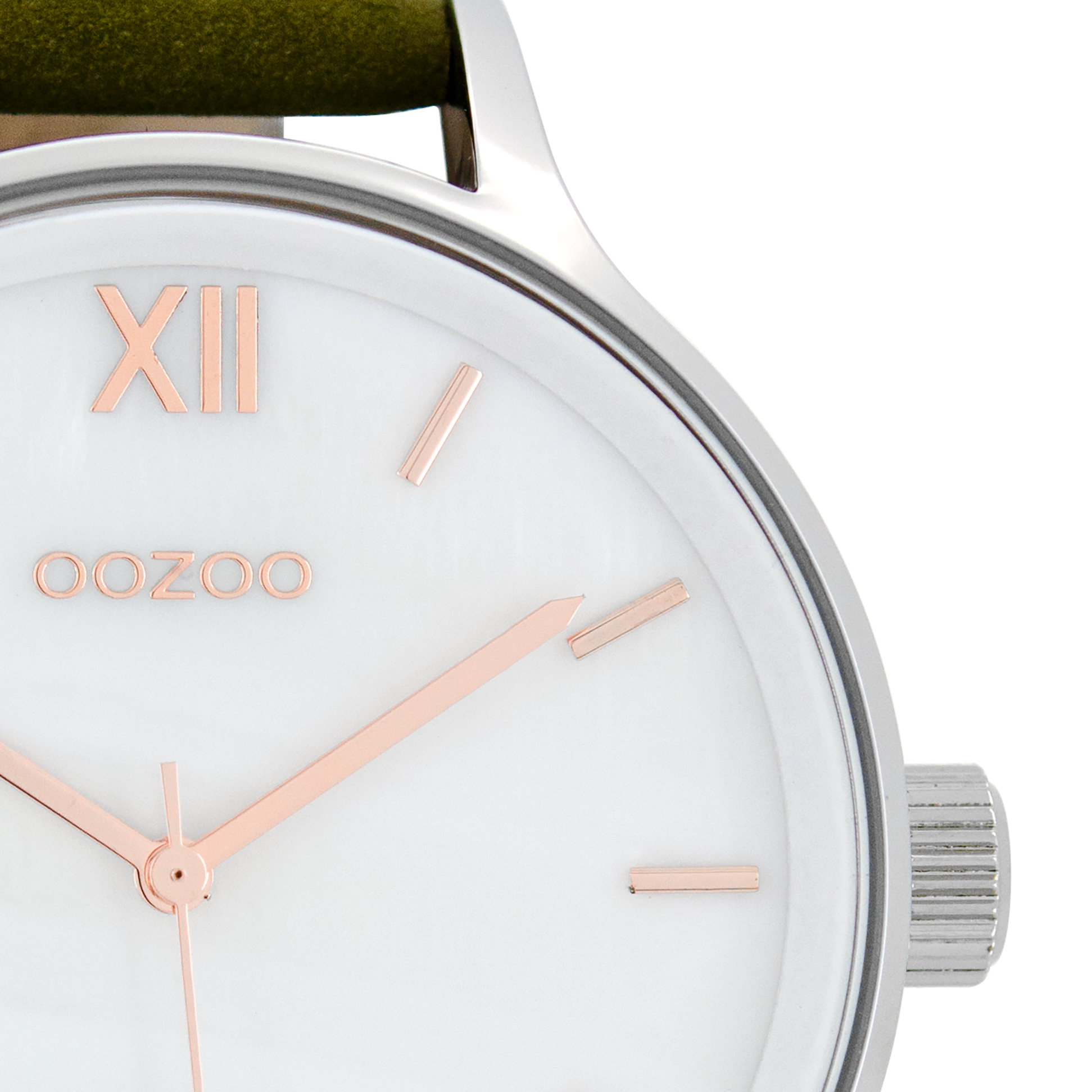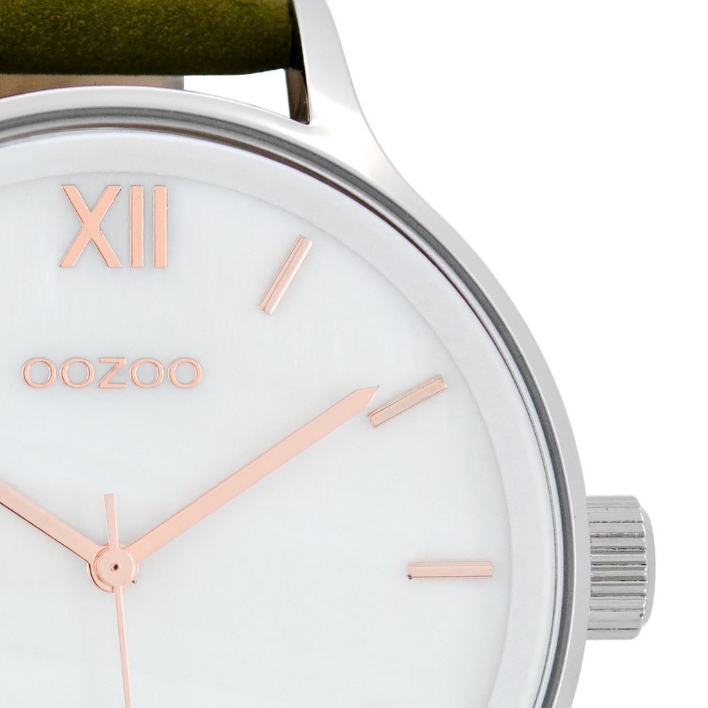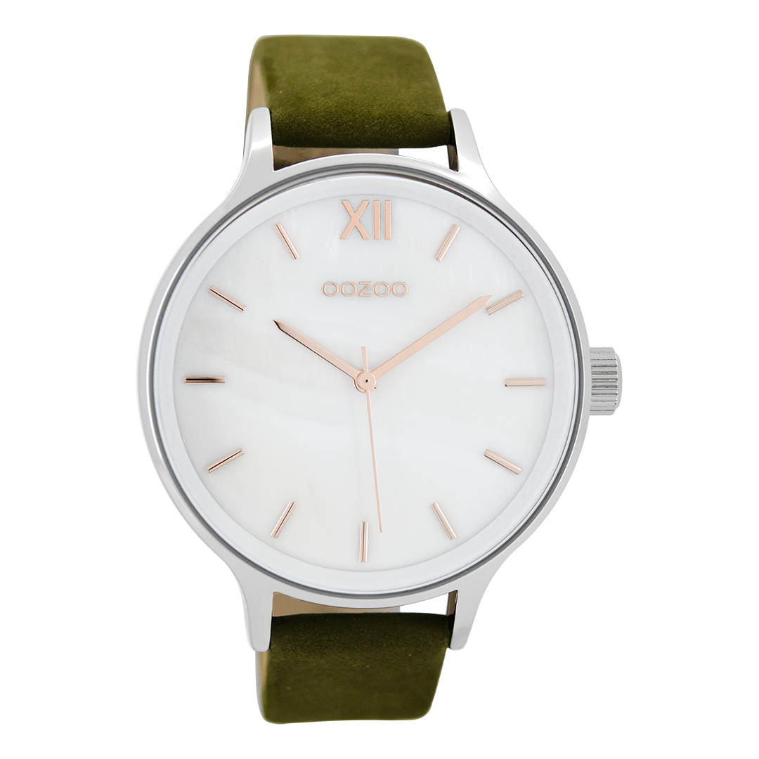 Stand out with this beautiful round ladies design from the trendy OOZOO Timepieces collection. The C8603 has a green leather strap and 45 mm silver coloured metal watch case. You are making quite the fashion statement with this white pearl dial, rose gold coloured stripes and roman numerals digits and matching hands. This essential watch for your wardrobe has a mineral glass, stainless steel backplate and is nickel safe. This watch has a 2 Japanese movement and is covered by a 2 year warranty (see section 3 of our Refund, shipping & warranty policy).