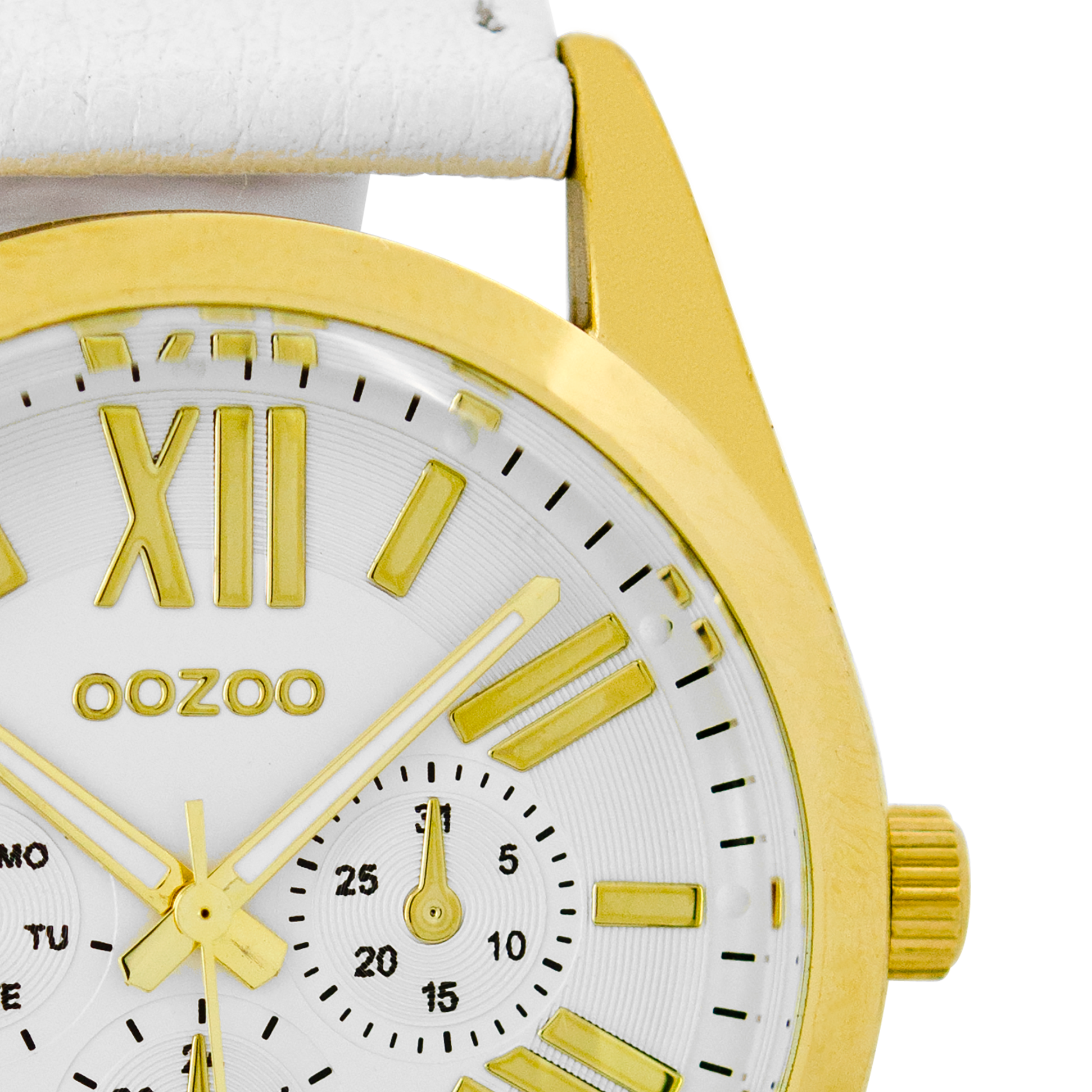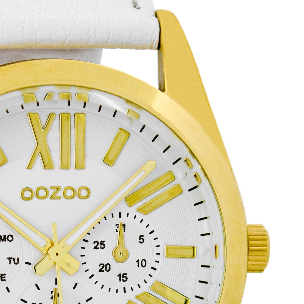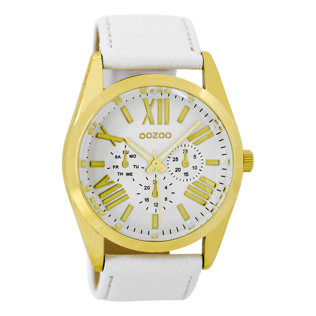 Stand out with this beautiful round ladies design from the trendy OOZOO Timepieces collection. The C8745 has a stitched white leather strap and 40 mm gold coloured metal watch case. You are making quite the fashion statement with this white chrono dial, gold coloured Roman numerals digits and gold coloured/white hands. This essential watch for your wardrobe has a mineral glass, stainless steel backplate and is nickel safe. This watch has a 2 Japanese movement and is covered by a 2 year warranty (see section 3 of our Refund, shipping & warranty policy).