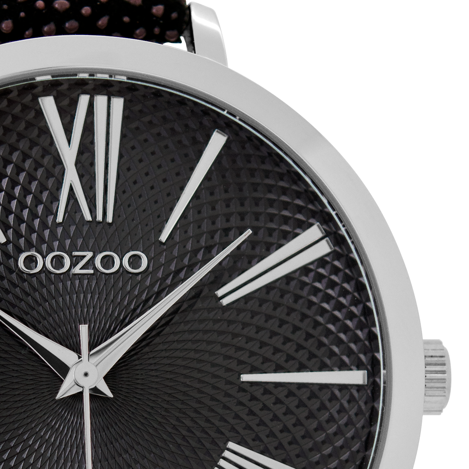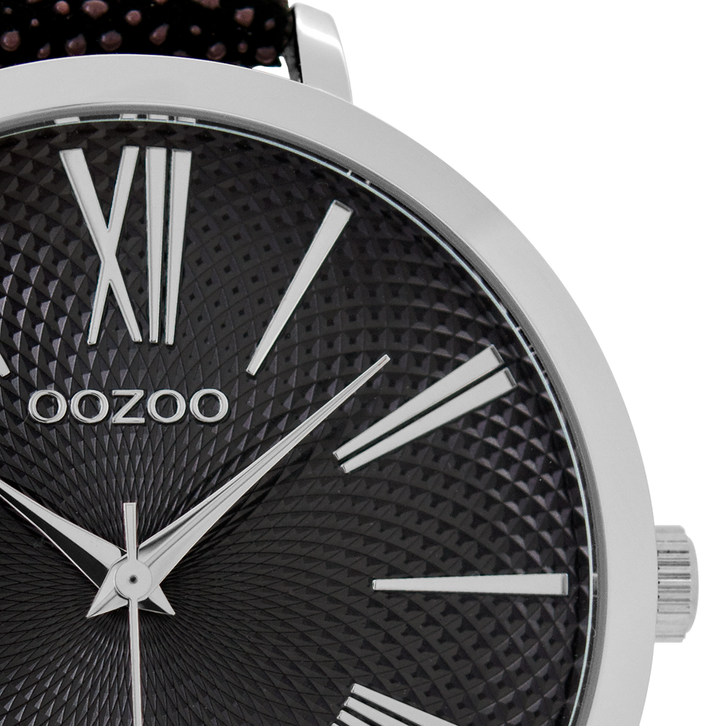 Stand out with this beautiful round ladies design from the trendy OOZOO Timepieces collection. The C9173 has a croco black leather strap and 48 mm silver coloured metal watch case. You are making quite the fashion statement with this black mosaic dial, silver coloured stripes and roman numerals digits and matching hands. This essential watch for your wardrobe has a mineral glass, stainless steel backplate and is nickel safe. This watch has a 2 Japanese movement and is covered by a 2 year warranty (see section 3 of our Refund, shipping & warranty policy).