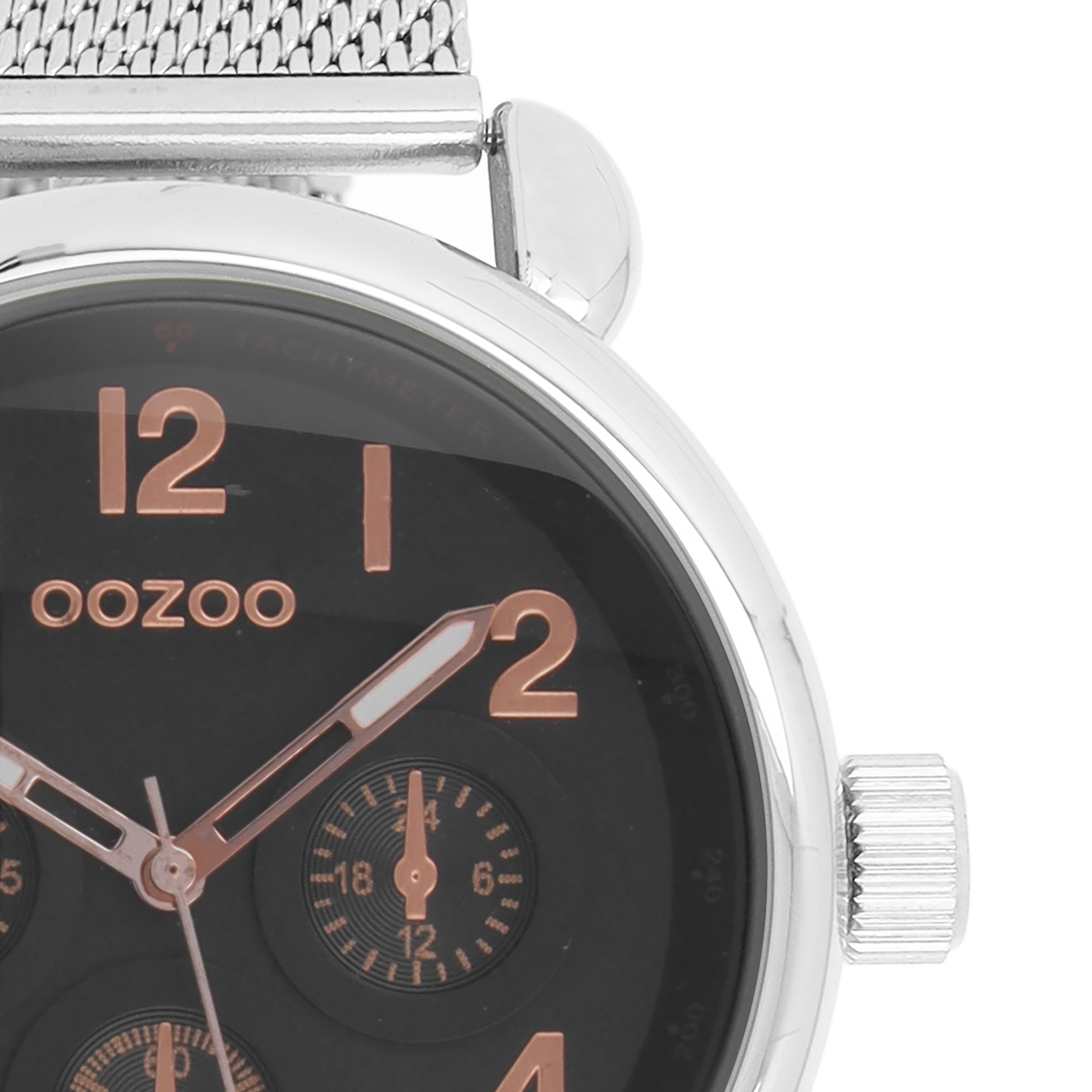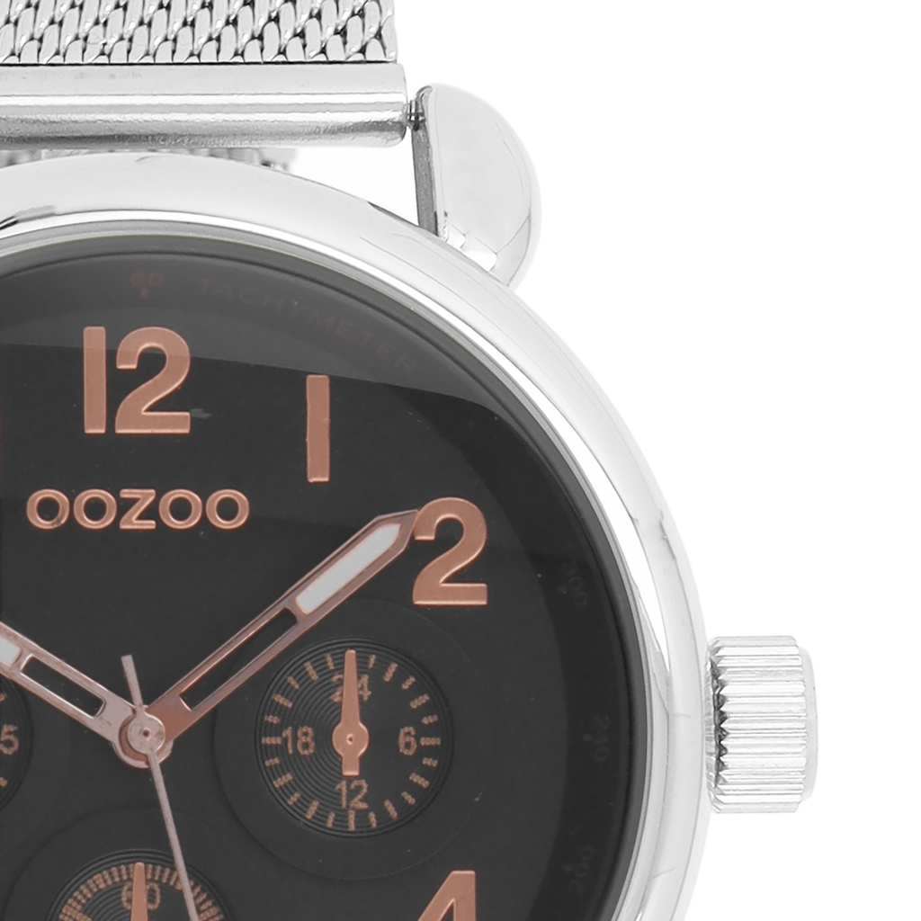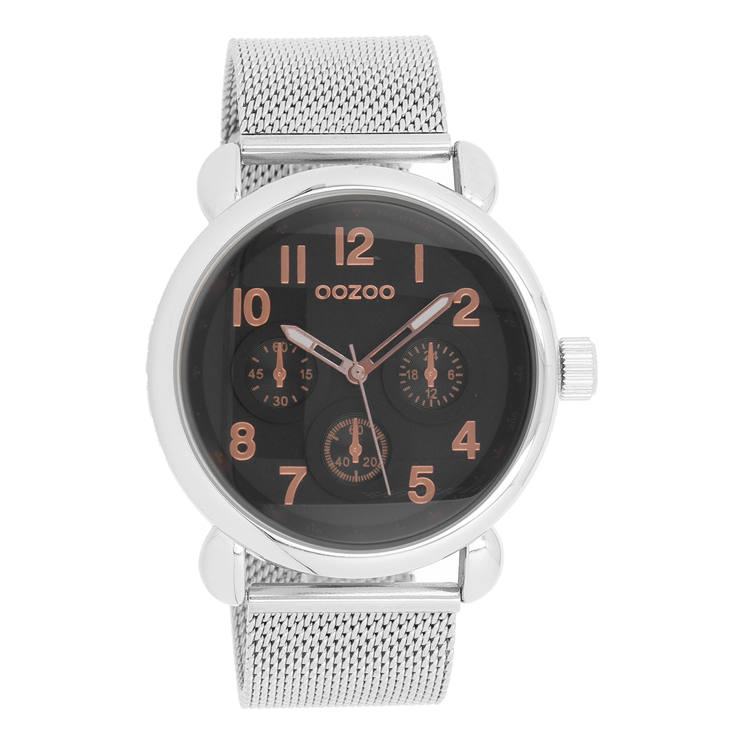 Stand out with this beautiful round unisex design from the trendy OOZOO Timepieces collection. The C9614 has a silver coloured metal mesh bracelet and 42 mm silver coloured metal watch case. You are making quite the fashion statement with this black chrono dial, rose gold coloured numbers digits and matching hands. This essential watch for your wardrobe has a mineral glass, stainless steel backplate and is nickel safe. This watch has a 2 Japanese movement and is covered by a 2 year warranty (see section 3 of our Refund, shipping & warranty policy).