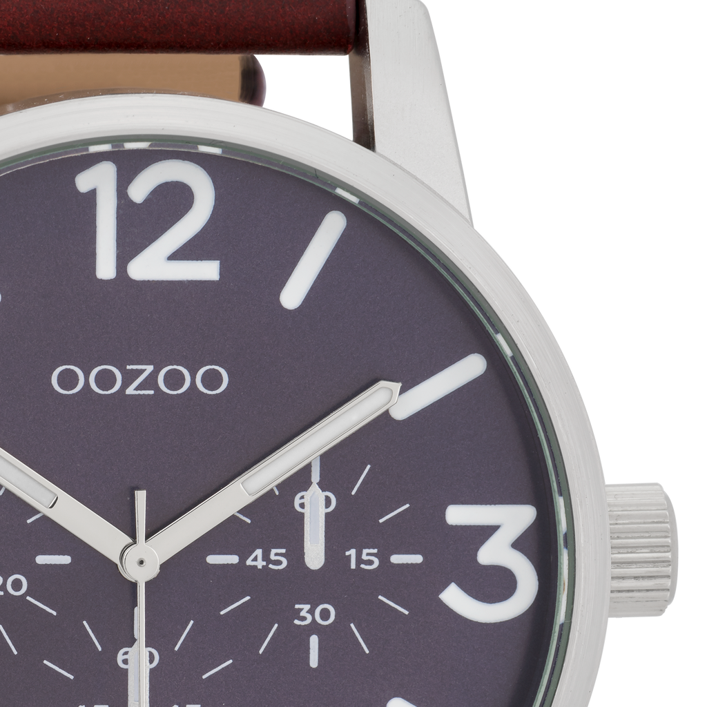 Silver coloured OOZOO watch with red brown leather strap - C9651